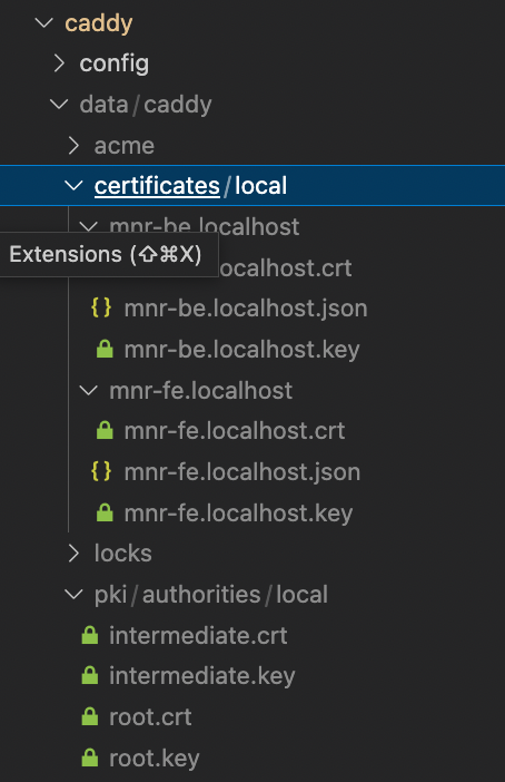 mnr-caddy-docker-caddy-1 | {"level":"info","ts":1661795136.231219,"logger":"http","msg":"enabling automatic TLS certificate management","domains":["fe.mnr.localhost","be.mnr.localhost"]}