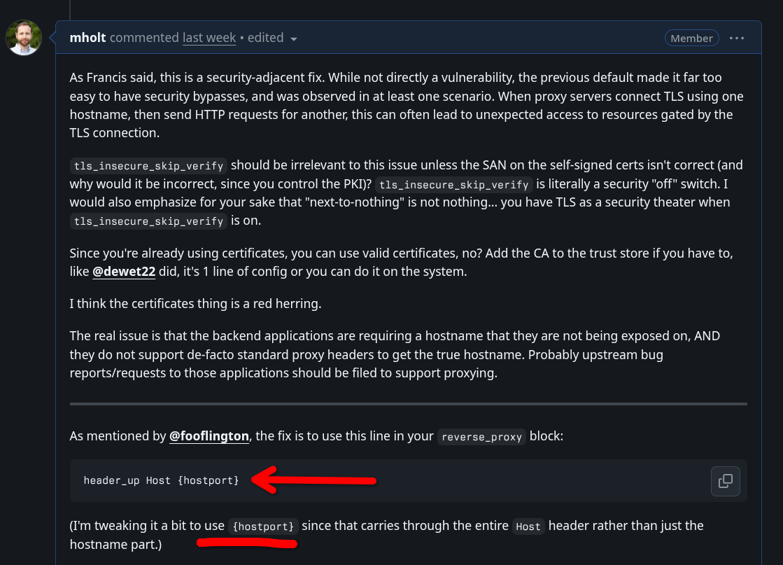 We’ve just upgraded our core ingress router to caddy 2.11 and to roll back to 2.10 as each of our reverse proxies to HTTPS backend using the tls_insecure_skip_verify config were broken; and annoyingly the result was an empty body with HTTP 200 OK, meaning our external and internal monitors relaying on status code response did not pick up the error.