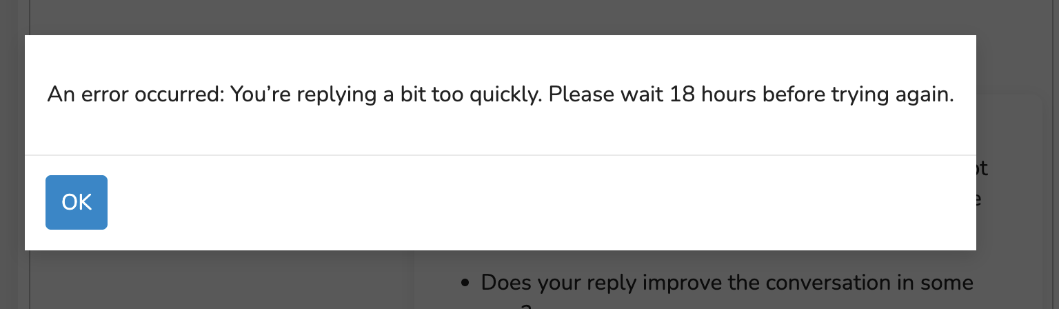 I created an account yesterday and made a post. I was not able to reply on the thread for some reason, even though I was promoted a trust level. I got an error saying I need to wait X hours. I ended up needing to wait 24 hours from when my account was created.